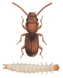 Their relatively high minimum breeding temperature of 18 to 22�c reflects their sub tropical origin. 40 - 50% RH is required for development. Eggs are laid singly within the foodstuff, adhering to it. Larvae attack food immediately on emergence, moving through approximately 4 moults before pupation which takes place in the food commodity. Adults emerge, mate and continue the cycle, which under optimum conditions may be completed within 20 days. In suitable conditions of high temperature, adults may fly.